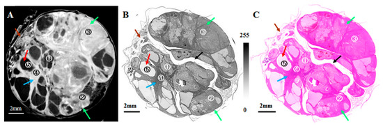 Tumor-bearing rat testis: (A) sectional CT image obtained by CXI; (B) corresponding histopathological (HE-stained) gray-scale image and (C) color image. Periphery of testis (brown arrow); cystic areas (red arrow); solid areas (green arrows); fibrous septa (blue arrow); artificially torn region in HE images (black arrow) (1, 2, 3: solid tumor areas, 4: fibrous septa, 5: cyst) [42].