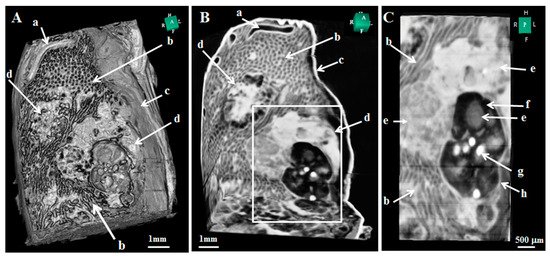 Three-dimensional image of tumor-bearing rat testis obtained by CXI. Serial cut sections of tumor: (A) surface area, (B) internal area, (C) enlargement of boxed region in (B); a: blood vessel, b: seminiferous tubules, c: tunica albuginea, d: tumor, e: different densities apparent in solid area of tumor, f: cystic area of tumor, g: blood clot, h: fibrous septa [42].