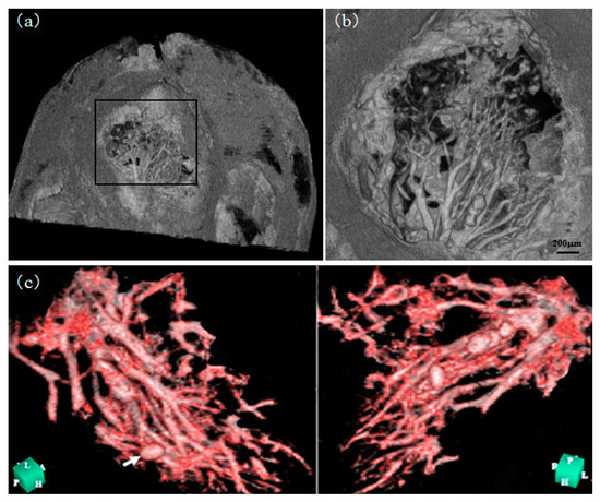 CXI shows minute density differences caused by various morphological structures within soft tissue tumors, such as solid cancerous masses, cystic and fibrous necrotic lesions, hemorrhages, and tumor vessels [39,40,41,42]. The resultant CT images resemble pathological pictures (magnification ×20) and clearly show the pathological features of tumors [42] (Figure 7). Minutely differing densities within tumors visualized using CXI correspond especially well to the different types of neoplastic cells in soft tissue tumors observed in pathological images [42]. Moreover, CXI provides three-dimensional (3D) information, yielding volume data with a density resolution of 0.3 mg/cm3. Furthermore, it is not labor-intensive and time-consuming such as histopathological staining. These 3D information capabilities enable the imaging of entire organs, which in turn enables the localization and size determination of various pathological lesions [42] (Figure 8). 3D images of tumor micro-vessels reconstructed from PX-CXI images without the use of contrast media enable evaluation of the vascular architecture (Figure 9) [40]. This ability to visualize pathological details and tumor vessels on the basis of density differences is an important breakthrough in the field of preclinical anticancer research.