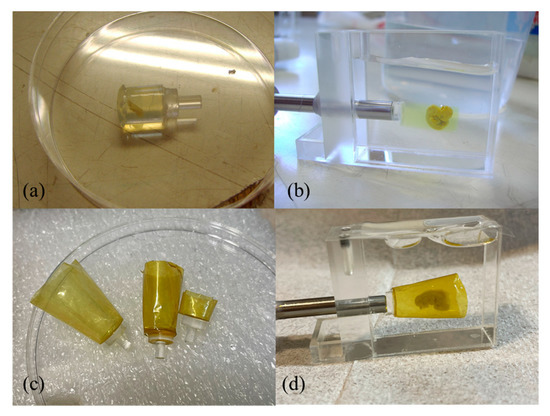 CXI is suitable for high-resolution embryonic imaging, as shown in Table 5. Also, the sample size that can be imaged with CXI is suitable for whole human embryos. The human embryo samples used in this study were obtained from the Kyoto Collection, which is one of the largest collections of human embryo specimens in the world and one of the few human samples that are ethically permitted for use [49]. When we planned to take images of human embryos using CXI, samples other than human embryos were used to be fixed directly to acrylic pranks, and the samples were discarded after imaging. For the reason that human embryos are precious, the imaging of CXI must be nondestructive. Therefore, we first developed a method for embedding samples in agarose gels. The gel was poured into a PVC tube approximately 1 cm in diameter and length, and the sample was fed into the tube as it hardened, resulting in a cylindrical sample encased in the gel. This gel cylinder was removed from the PVC tube, fixed directly to an acrylic plate with instant adhesive (Figure 10a), and mounted on an acrylic cell (Figure 10b). Imaging was performed in these states, and the resultant images were acquired at a resolution suitable for analysis. The sample was rotated slightly during imaging. To further reduce the gel shaking that occurred during this process and improve the image quality, a cup-shaped part was made of Kapton polyimide film (Figure 10c), into which the gel was poured, and the sample was fixed (Figure 10d). This method is currently used for imaging purposes.