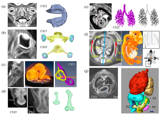 Representative studies using CXI images acquired from the Kyoto collection. CT planes and reconstructed images were shown. (a): Coronal plane of the face and reconstruction of the secondary palate immediately before fusion (Carnegie stage (CS) 23) [50]. (b): Sagittal plane of the eyeball and reconstruction of the eyeball using the optic nerve (CS17 and CS19) [51]. (c): Transverse plane of the temporal bone and reconstruction of the inner ear with an enlarged brain and inner ear (CS21) [52]. (d): Sagittal plane of the thigh and reconstruction of the femur (CS19, CS21) [53]. (e): Transverse plane of the thorax, reconstruction, and median line of the bronchial tree (CS22) [54]. (f): Transverse plane of the thorax, reconstruction of the entire embryo and thoracic cage, and analysis of the reconstructed image (CS22) [55]. (g): Transverse plane of the thorax and abdomen and reconstruction of the thoracic and abdominal organs (CS21) [56]. In this sample, the liver is defective, and the positions of the stomach, pancreas, and heart have been changed.