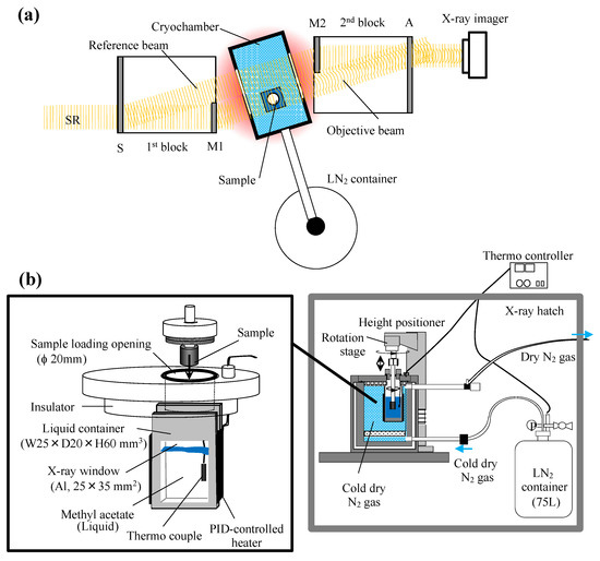 The thermal effect in a crystal-based XI is not negligible because the thermal drift of the deformations of crystal wafers in a crystal-based XI reduces the sensitivity of CXI. The cryochamber (Figure 12a), including the X-ray window, was insulated with a vacuum layer to maintain the temperature of the crystal-based XI. The X-ray windows were made of aluminum foil and were 60 × 30 mm. They were placed at each end of the sample chamber for CXI measurement so that the object and reference X-ray beams could pass through the crystal-based XI and recombine (Figure 12b). The temperature inside the cryochamber was controlled by blowing temperature-controlled dry N2 gas, supplied by a liquid N2 container, continuously for more than 24 h. During X-ray measurement, a sample is introduced into a container consisting of two X-ray windows 25 × 35 mm (Figure 12b): cylindrical samples with sizes up to a maximum diameter of 15 mm and 20 mm in length can be measured. The container is filled with a buffer liquid to keep the density difference between the sample and the surrounding area within the dynamic range, and to maintain the sample temperature between 190 and 370 K [57]. Two sheet heaters attached to the container maintain the temperature of the liquid within ±1 K. Accordingly, the liquid controls the sample temperature and prevents undesirable outline contrasts from the outer surface of the sample. For measurement of icy materials, methyl acetate was used as the buffer liquid to reduce the density differences between the sample and background area because the density of methyl acetate is 0.928 g/cm3 at 298 K, which is close to that of hexagonal ice (0.917 g/cm3 at 273 K), and methyl acetate remains in the liquid state even at low temperatures (>175 K). The type of liquid is selected on the basis of the density of the sample and the experimental temperature. For example, the type of liquid can be water, normal saline, or another solution.
