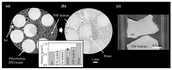 X-ray images of THF hydrates: (a) THF hydrate with ice at 253 K and (b) THF hydrate with water at 276 K at interparticle pore spaces obtained by CXI [63]. Densities of ice, CH4, and air hydrates are the values at 233 K, and those of THF hydrate and water are the values at 273 K. HDPE denotes high-density polyethylene. (c) Absorption contrast image of THF hydrate and ice in a polypropylene (PP) tube at 123 K measured by monochromatic X-rays of 8 keV using synchrotron radiation, where the two cannot be distinguished [64].