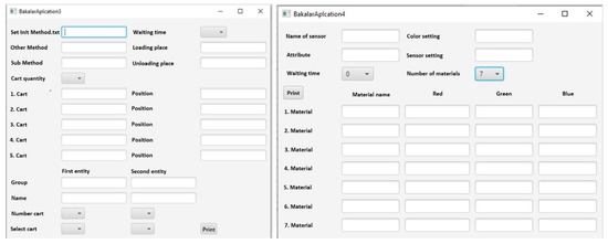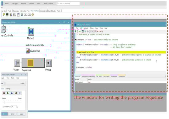 The basic settings of the elements in the model, which did not need to be programmed, were defined through the object windows. It was about the graphic parameters of the materials, the sensor settings, the logistic train speed, and the processing time for the workplace. An example of defining parameters through object windows and built-in functionalities is shown in Figure 7.