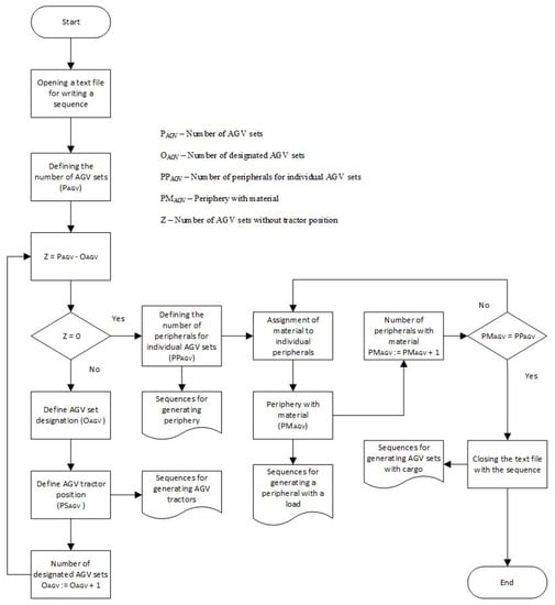 The application thus created was designed to gradually guide the user through the input of the required data to the final generation of the sequence for the needs of additional programming in the form of a text file, which will consist of a program sequence in the SimTalk language. At the same time, the main advantage of the console application was exploited here, namely the creation of a large number of variables compared to the graphical solution. The whole application was built on a loop where the control variables (number of AGV sets, number of peripherals, and material transported) were set at the beginning. Subsequently, their unique names and other critical information had to be defined. As this was a console application, the resulting solution was not limited by space, but on the other hand, this solution offers less clarity.
