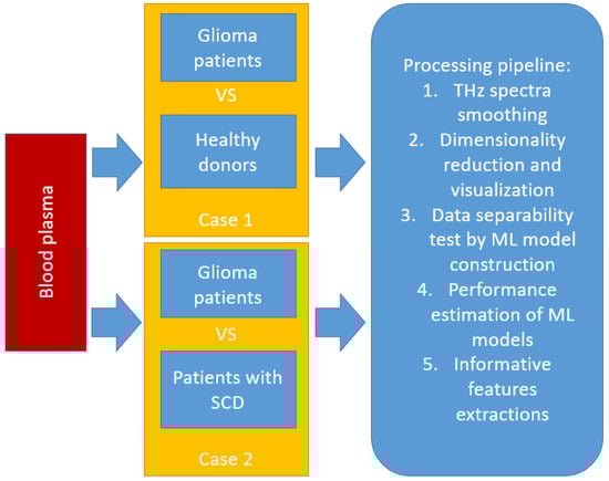 The analysis of the experimental THz data was performed according to the ML pipeline, as presented in Figure 2. In the first stage, data were split into two groups: patients with glioma versus healthy donors (Case 1), and patients with glioma versus patients with SCD (Case 2). A computational processing pipeline was implemented on Python (3.9; here and below, version of the software placed in round brackets) with scikit-learn (1.2.1), scipy (1.9.1), and catboost (1.0.6) libraries. It included THz spectra smoothing using a Savitzky–Golay filter, dimensionality reduction and visualization using PCA and t-SNE methods, and data separability tests using SVM, RF, and XGBoost. The choice of the latter was restricted by the requirement of interpretability of the results. PCA allows the reduction of the dimensionality of the original data by projecting it onto the new coordinate axes (principal components, PCs) by maximizing explained variance. The major difference between PCA and t-SNE methods is that PCA can be trained and then reapplied on the new, unseen data, whereas t-SNE needs to relearn. The advantage of t-SNE is the consideration of distances in the original data. This means that if spectra are close in some metrics in the input data, then after projecting the data to a lower dimension space, points will be close too. It should be mentioned that t-SNE Python implementation (sklearn.manifold.TSNE) has crucial parameters: perplexity and metrics. RF and XGBoost methods are both tree-based ensemble classifiers [57]. The difference between them lies in the training process. XGBoost adds a random decision tree classifier to correct the erroneously classified samples, thus improving the accuracy of data separation. The RF method used on each iteration step of the training process found the best random subset of features for the given classifier to construct the ensemble one [58]. These methods explicitly find most informative features during the training process, so the confidence in the constructed data models is high [59].