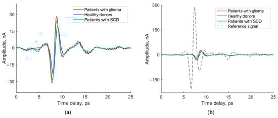 Mean time-resolved THz signals for each group (a), and the same graphs but compared to the reference signal (b): glioma patients (red line), healthy donors (blue line), patients with SDC (green line), and reference signal (dotted line).