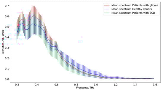 Mean THz intensity spectra for blood plasma of glioma patients (red line), healthy donors (blue line), and patients with SCD (green line). All data points have their own bar (vertical line), representing data variance.