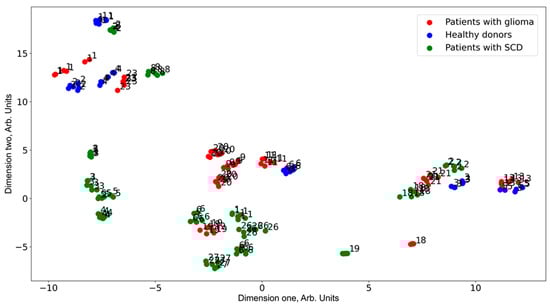 At the second stage, data dimensionality reduction was conducted using the PCA and t-SNE methods. In Figure 5, we present the t-SNE visualization. Numbers near markers correspond to the sample ID in each group. Groups are marked by different colors. T-SNE relies on the distance between original spectra, so it does not matter how many groups are under study, contrary to PCA. In Figure 5, we can verify that spectra recorded from one sample are similar. Additionally, tumor and healthy samples form large clusters, but there are outliers.