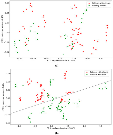 Graphs of the cumulative explained variance to find the maximum allowed number of PCs for the blood plasma of glioma patients and donors, and the blood plasma of glioma patients and patients with SCD, are given in the Supplementary Materials (Figure S1). A steeper curve indirectly indicates that the first PCs contain more valuable data. The smoother ones indicate an even contribution of the PCs and the need to analyze more combinations of them.