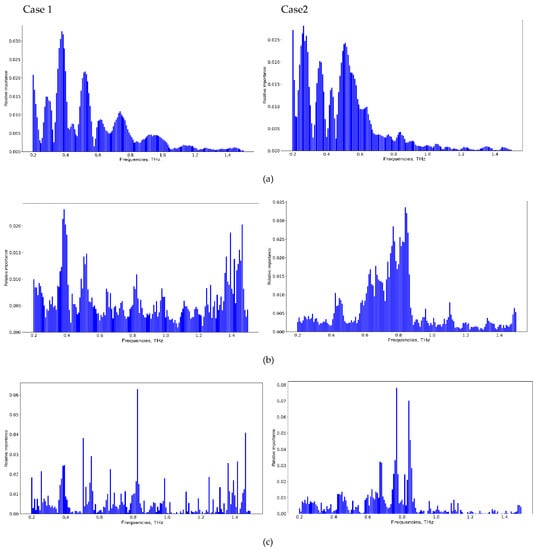 Informative frequencies for Case 1 and Case 2 with different classifiers: (a)—linear kernel SVM; (b)—RF; (c)—XGBoost.