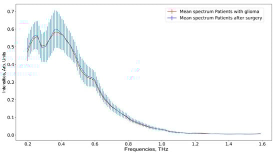 In Figure 3a we present mean time-resolved THz signals for each group, and in Figure 3b the same graphs but compared to the reference THz signal from an empty cuvette. The time delay and decrease in the signal amplitude when the sample was introduced into the cuvette was associated with the plasma impact in the THz wave transformation. The THz signal for healthy donors was shown to have a smaller amplitude, and was mixed to the right by 0.25 ps relative to the samples of patients with and without glioma, which show similar trends in the overall shape of the curve with a small difference in the THz signal amplitude.