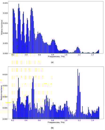 According to Figure 9, the most informative frequencies are 0.56 and 1.2 THz. Though they did not coincide with the frequencies with the highest variance, both RF and XGBoost methods considered them to be the most informative ones. The possible reason is that these methods tested separability by each frequency, disregarding the absolute value of the data variance.