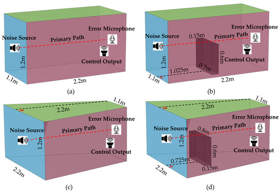 Four simulation schemes for the ANC, (a) Obstacle-free Rectangular Enclosed Space (b) Rectangular Enclosed Space with Obstacle (c) Obstacle-free Trapezoidal Enclosed Space (d) Trapezoidal Enclosed Space with Obstacle.