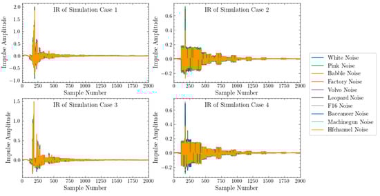 A key point of ANC simulation is to obtain the impulse response (IR) of the primary path, which is the basis of ANC algorithm design. The IR of the primary path is affected by different environments and different noise types, so the IR of the primary path must be obtained under four simulation schemes for each noise type as shown in Figure 7. The shape of the enclosed space has an important impact on the IR of the primary path. However, the impact of noise type on IR is not obvious. After obtaining the IR of different noise types in different simulation situations, it can get the primary noise by convolution operation between IR and the input noise. Then, the design and analysis of ANC algorithm can be carried out on the basis of the simulation results.