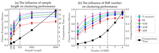This paper mainly studies the influence of noise data sampling length and decomposed IMF numbers on clustering performance. As shown by Figure 8a, the optimal noise sampling length is 512 from the perspective of noise clustering performance and computation. Before using the clustering algorithm to classify different types of noise, the raw noise data set was processed with VMD. A key factor affecting VMD feature extraction is the numbers of decomposed IMF. The clustering evaluation indicator values and computation times for different numbers of decomposed IMF are shown as Figure 8b. As shown in this figure, the optimal number of IMF was 6.