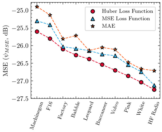 To compare the influences of different structural parameters on GBDT performance, the mean-square error (MSE), defined as , was used. The performance of the GBDT (Gradient Boosting Decision Tree) regressor was mainly affected by the loss function, maximum depth and number of estimators of the individual regression estimators.The regression loss functions commonly used by GBDT include Mean Squared Error (MSE), Mean Absolute Error (MAE) and Huber error. The mean de-noise effects for three different loss functions in the 10 types of noise datasets are shown in Figure 10.