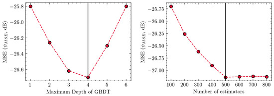 Influences of maximum depth and number of estimators on the regression performance of GBDT were examined. In order to simplify the determination architecture of GBDT, it was assumed that different noise types have the same GBDT structure. Using a trial-and-error method, the regression performance indicator MSE corresponding the maximum depth ranging from one to six and the number of estimators ranging from 100 to 700 were studied. Using factory noise as an example, the influence of maximum depth and number of estimators on the GBDT regression performance is shown in Figure 11. Therefore, the optimal maximum depth and number of estimators of GBDT used in this paper were four and 500, respectively.