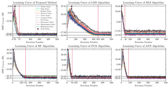 The proposed method is compared against several other algorithms: least mean square (LMS) [28], recursive least square (RLS) [29], random forest (RF), support vector machine (SVM) and artificial neural network (ANN), in terms of the ANC performance. Generally, the LMS algorithm is simple and easy to implement with low complexity. But it has the disadvantages of a slow convergence rate and poor tracing performance. Recursive least square (RLS) algorithm has better convergence speed and tracing performance with higher computation complexity compared with LMS algorithm. Figure 12 shows the de-noising learning curves of proposed method, LMS, RLS, RF, SVM and ANN for 10 types of noise datasets with 500 steps iteration.