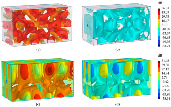 The ANC simulation results of rectangular enclosed space, (a) SPL without ANC for Obstacle-free Rectangular Enclosed Space, (b) SPL with ANC for Obstacle-free Rectangular Enclosed Space, (c) SPL without ANC for Rectangular Enclosed Space with Obstacle, (d) SPL with ANC for Rectangular Enclosed Space with Obstacle.