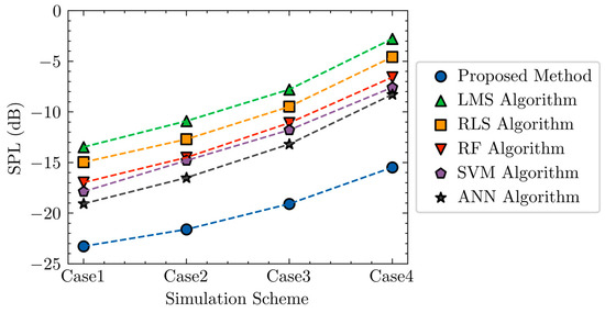 In another example, LMS, RLS, RF, SVM and ANN algorithms were used for ANC of machine gun noise using the four simulation schemes as above. Their noise attenuation effects are shown in Figure 15. The noise attenuation effect of the LMS algorithm for four simulation schemes are −13.47 dB, −10.9 dB, −7.78 dB and −2.75 dB respectively. The noise attenuation effect of the RLS algorithm for the four simulation schemes are −14.93 dB, −12.72 dB, −9.46 dB and −4.53 dB respectively. The noise attenuation effect of the RF algorithm for four simulation schemes are −16.96 dB, −14.5 dB, −11.06 dB and −6.59 dB respectively. The noise attenuation effect of the SVM algorithm for four simulation schemes are −17.86 dB, −14.77 dB, −11.72 dB and −7.54 dB respectively. The noise attenuation effect of ANN algorithm for four simulation schemes are −19.03 dB, −16.54 dB, −13.18 dB and −8.26 dB respectively. Therefore, it can be found that the noise attenuation effect of the proposed method is much better than that of algorithms of LMS, RLS, RF, SVM and ANN.