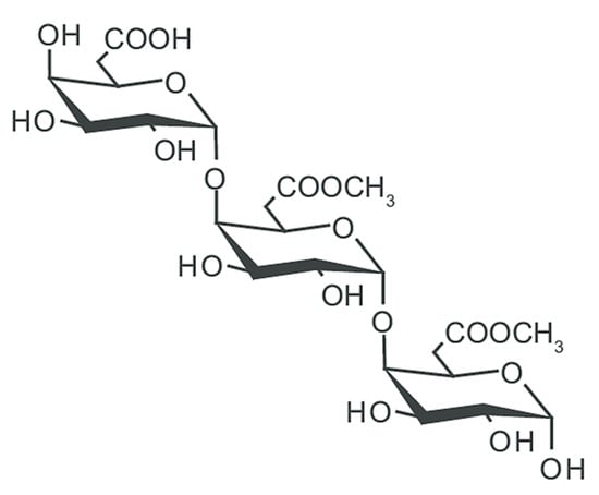 Pectin (E440) (Figure 4) is widely used as a gelling and stabilizing agent in a variety of food products and finds increasing use in biomedical applications for its high safety, biocompatibility, and biodegradability. Chemically speaking, pectins are heterogeneous biological polymers consisting of covalently bound galacturonate molecules [27,54,55]. The exact structure is still under study due to its high variability depending on the plant source. However, the main polysaccharide components with a clearly determined chemical structure were isolated: homogalacturonan (65%), ramnogalacturonans I (20–35%) and II, replaced galacturonans, xylogalacturonan, and apiogalacturonan.