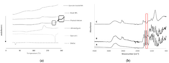 - Doost, S.A.; Muhammad, D.R.A.; Stevens, C.V.; Dewettinck, K.; van der Meeren, P. Fabrication and Characterization of Quercetin Loaded Almond Gum-Shellac Nanoparticles Prepared by Antisolvent Precipitation. Food Hydrocoll. 2018, 83, 190–201. [Google Scholar] [CrossRef]