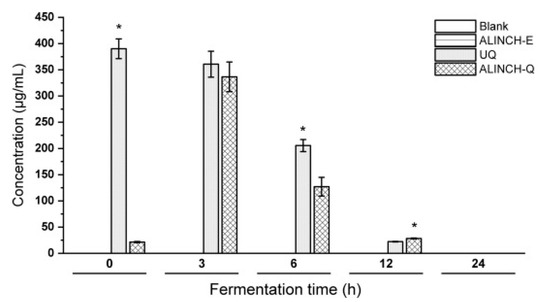 The release of total polyphenol content (TPC) of propolis in different food simulants showed, after 1 h, an increasing release rate (%R) of TPC from water (%R = 60%), to 10% ethanol (%R = 68%), to 50% ethanol (%R = 85%). In the first hour of release in all food models, propolis showed a rapid release that can be explained by surface fraction of polyphenols. The maximum amount of release was obtained in 50% ethanol, due to the higher solubility of propolis in this solvent than in water. In simulated GIT environments, propolis showed a sustained release at a constant rate; the cumulative release of propolis in gastric (pH = 1.2, after 2 h) and intestinal (pH 6.8, after 8 h) environments was about 23% and 49%, respectively [77].