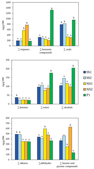 The alkanes were one of the major groups, with 11 identified compounds. Alkanes are present in different types of wood and have been identified in corks [20]. The SS1 and SS2 samples, both from the same geographical origin, were the ones that showed significantly higher concentrations of alkanes (Figure 1), with tetradecane, dodecane and hexadecane being the majority in all samples. The NS1, NS2 and P1 samples, although they were of different geographical origin, did not present statistically significant differences in the total concentration of alkanes.