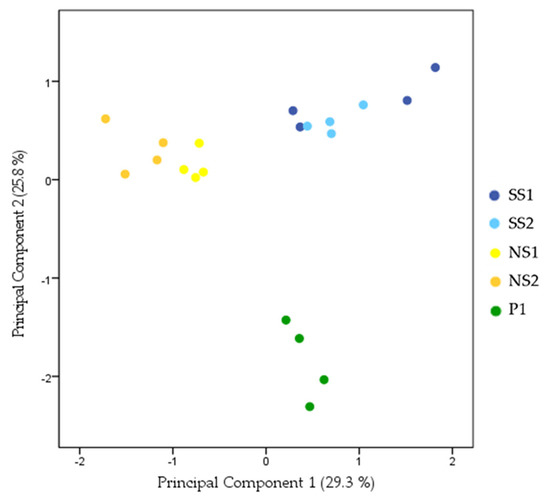 Aldehydes and ketones were among the other volatile carbonyl compounds identified in the cork samples. These compounds are produced through the lipid oxidation of free fatty acids found in the waxlike and suberin fractions of the corks [21]. The total aldehyde content was higher in the NS1 samples, primarily due to the greater concentration of nonanal resulting from the oxidation of oleic acid. However, the NS2 corks, which shared the same geographical origin, did not show significant differences from the rest of the samples. Some of the aldehydes identified, such as (E)-2-octenal, decanal and (E)-2-nonenal, have been associated with the “sawdust” aroma of wines aged in new oak wood barrels [31]. Regarding ketones, SS1 corks with a higher 2-heptanone content stood out, although no significant differences were found with the SS2 corks, which were also from southern Spain.