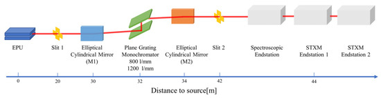 Layout of the BL08U1A beamline at the SSRF. The M1 elliptical cylindrical mirror collimates the X-ray and suppresses high-order harmonics. The M2 elliptical cylindrical mirror focuses the X-ray in both directions through Slit 2. The tunable X-ray energy is 200–2000 eV. A spectroscopic end station and two STXM end stations are located downstream of the beamline.