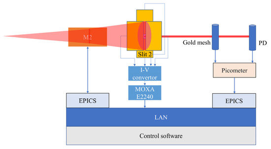 All digital signals and control access of the hardware are connected and controlled by the control software through a local area network (LAN), as shown in Figure 2. The control software has access to the converted Slit 2 blade edge voltage signals, gold mesh current signal, PD current signal, and motor signals of M2. In addition, the software controls the movement of M2 position based on a suitable logic criterion to maintain the optimal X-ray flux of the sample.