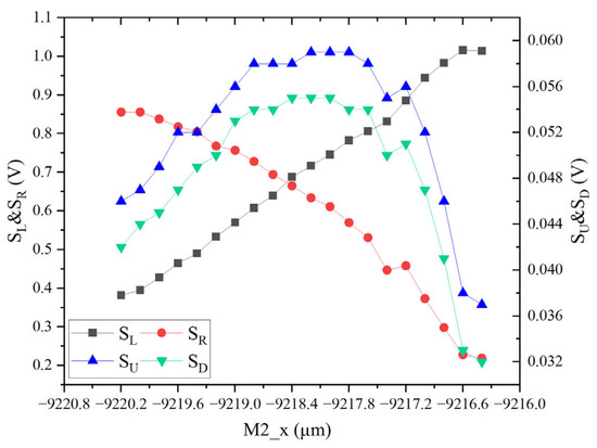 The automatic feedback system is optimized under the condition that all beamline devices on the optical path are optically aligned and the EPU gap and PGM angle are selected. Figure 3 shows the change in the four blade-edge voltage signals along with the position changes of M2, where the incident X-ray energy is 920 eV and the Slit 2 size is 50 μm × 50 μm. SL, SR, SU and SD represent the left, right, up, and down blade-edge signals. The change in the horizontal signals is an order of magnitude larger than the change in the vertical signals, indicating that the deviation in the light spot in the horizontal direction is much larger than that in the vertical direction. Therefore, only horizontal deviation is considered in the feedback system, and the horizontal blade-edge signals are used to assess the position of the X-ray light flux in the downstream optical path of Slit 2.
