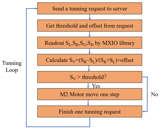 The logic of each tunning procedure. When the server gets a tunning request with threshold and offset values, it will try to read out SL, SR, SU and SD and calculate Sv. If Sv is bigger than the threshold, the M2 motor will move one step (200 nm); otherwise, it will jump directly to the end of this tunning and waiting for the next tunning call.