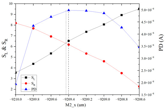 Calibrate slit signals using PD at 540 eV. The left dotted vertical line marks the first M2 position of SL = SR. The right dashed vertical line marks the second M2 position of the maximum PD value. For the second position, SRL is calculated to be −2.677%. However, the light flux of the first position is 99.12% of the second position. Considering that the M2 stepping motor with a 200 nm minimum step size cannot distinguish between the two positions, the difference in the two light fluxes can be ignored; thus, the offset value is set to 0 in practical applications.