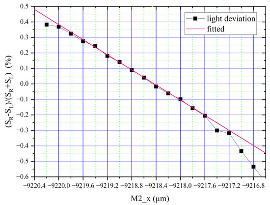 The measurement result of the left and right blade-edge signals, along with the M2 position changes at 920 eV. The minimum moving precision of the M2 motor is 200 nm. The experimental data were fitted with a straight line, and the linear area slope shows the position changes of SRL changes as M2 moves per 200 nm. It is found that the threshold value is less than 0.05.