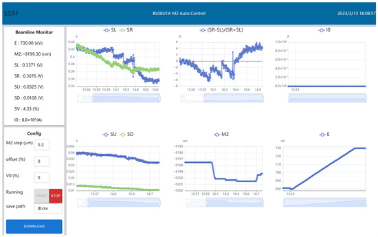 The browser user interface for the online automatic feedback system is shown in Figure 8. The “Beamline Monitor” panel in the top left corner provides current readings of E (energy), M2, SL, SR, SU, SD, SV and I0. The “Config” panel in the bottom-left corner has inputs of M2 step, offset and V0, as well as a running button and export data function components. The main part of the interface on the right side is the chart area, which displays all signals with a maximum of 12 h of data. Each chart has a slider on the x-axis for observing smaller time scales. The signals in the chart area and in the Beamline Monitor panel are updated by the server every second.