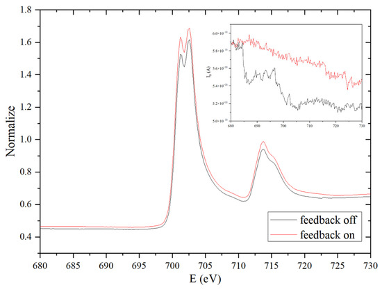 The normalized absorption spectrums of an Fe sample holder with and without the online automatic feedback system are shown in Figure 9. The intensity of the X-ray before the sample position during the experiment, which is collected by the gold mesh, is displayed at the top right of Figure 9.