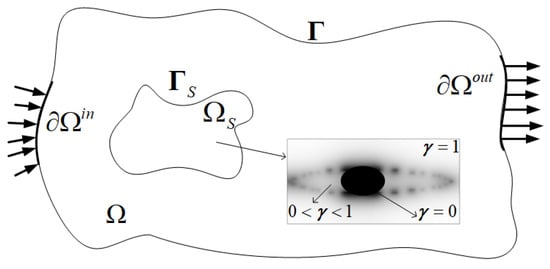 We seek the optimum body shapes in the flow. To achieve that, we first introduce γ ∈ {0, 1} as the design variable, which is a binary distribution defined in the design domain. Respectively, 0 and 1 represent the solid phase and liquid phase, corresponding to the presence or absence of material at an arbitrary point within the design domain. In this problem, the distribution of the solid material is the optimal body structure we expect to obtain within the flow field, so the essence of the topology optimization is an optimization problem with 0–1 discrete variables. In order to adopt an optimization algorithm based on continuous variables and avoid the difficulties of solving binary optimization problems, we can relax γ to [0, 1] to achieve continuous variation. Figure 1 is a schematic representation of the fluid topology optimization problem. The shape optimization problem is defined in a bounded domain Ω. Ω is the fluid domain and ΩS is the design domain; both of them are separated by the boundary ΓS.