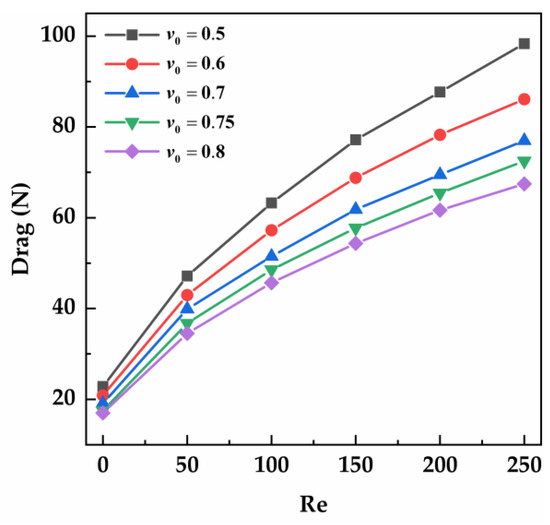 At the same time, drag values increase with the proportion of solid materials and the Reynolds number increases from Figure 4.