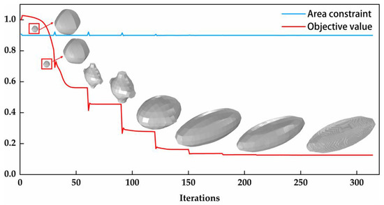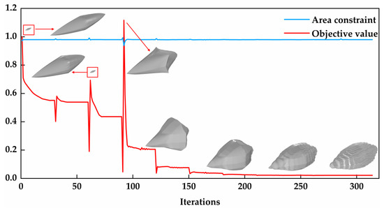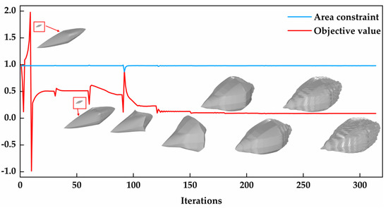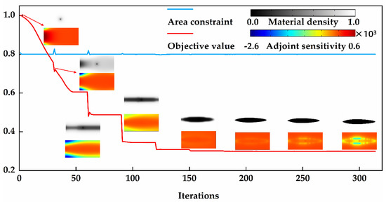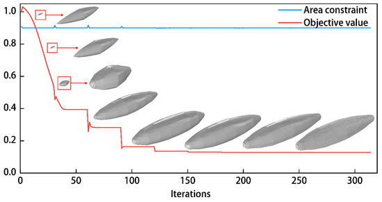 In addition to the value of area fraction, we also investigate the convergence of objective value and area constraint during the numerical computation to ensure the robustness and uniqueness of the solution. The accuracy of the area fraction is set to and convergence performances of topology optimization for 2D drag reduction problem in laminar flow conditions are good. Figure 5 shows the convergence history and evolution curve of the iterative solution of the 2D model obtained by numerical computation with the Reynolds number of 200, the mesh density of 30, and the area fraction of 0.8. It can be observed that the initial topology is generated from the set central fixed point, and as the number of optimization iterations grows, the density projection gradually converges to 0 and 1 and the topology is gradually clear and complete. In fact, after the 180th iteration equivalent to , the objective value (0.3014) is basically unchanged and does not differ much from the result (0.2997) of the 315th iteration, but the density projection of the latter is closer to the 0–1 binary distribution and the results are clearer. Furthermore, the results show a convergence history with overall monotonicity and basically no local jumps caused by the projection operation. Therefore, the robustness of the numerical iterative solution can be confirmed and the structure is stable in the current setup conditions.