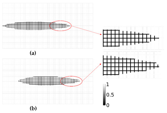 This paper uses the fixed mesh achieved by mapping and sweeping operations. The number of the mesh in the computational domain of the 2D problem is 63,000. We give an example of the mesh representation of the result of Figure 6i in Figure 8. At the same time, the difference of shapes corresponding to different objective functions can be clearly seen from the mesh representation. Figure 8a,b correspond to objective functions and , respectively.