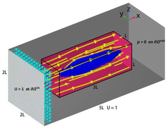 The problem of the optimal body shape can be traced back to Pironeau’s research [27] on the minimum drag in Stokes flow. Later on, some problems on drag and lift were studied [28,29,30,31,32]. Reference [29] studies the drag and lift of the 2D time-dependent flow around a cylinder. As the fluid stream passes the topmost part of the cylinder, it tends to separate from the top surface and peel off in a clockwise motion as it approaches the rear end of the cylinder, ending up as a shed vortex which can be quantified [33] and represents a dangerous structural problem [34]. In relevant fluid dynamics problems, uncertainty quantification is often used to introduce the uncertainty into a mathematical and physical model to make it more realistic [35,36]. In the topology optimization of fluid, Borrvall and Peterson [37] develop a porous media model for the Stokes flow, which was soon extended to the Navier-Stokes flow [38,39]. In this model, porous media is filled in the two-dimensional(2D) or three-dimensional(3D) design domain, and the artificial Darcy friction is added to the Stokes equation and the Navier-Stokes equation to characterize the effect of the material on the fluid. [40] gives a detailed introduction to density-based topology optimization of fluid flow problems with implementation in MATLAB. Compared with [38,39], we extend topology optimization to 3D external flow problems. In this paper, porous media is filled in a steady incompressible fluid, and material density is applied for implementing material interpolation. Meanwhile, the finite element method is used to solve the governing equations; the adjoint sensitivity is analyzed by the continuous adjoint method to update the design variable and iteratively evolve the fluid structure. The objective function takes the volume integral form of the drag expression to solve external flow problems. The variable density topology optimization model of Navier-Stokes flow is established to study the 2D and 3D body shape for drag reduction.