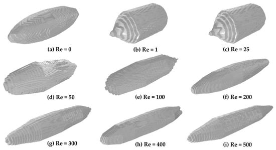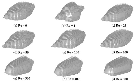 The optimization body shapes at various Reynolds numbers are governed by objective function shown in Figure 10. The 3D topology optimization is a standard ellipsoid with Re = 0. When Reynolds number tends to zero, it expresses a state that the inertia force is infinitesimal and can be ignored and there is hardly any memory of the flow state of the previous moment. We express it as Re = 0 for convenience. The structures are similar for Re of 1 and 25, whose shapes are pointed cone-shaped at the head, with a gradually narrowing column from the middle section to the tail section, and a concave area at the tail. As the Reynolds number continues to increase from 50 to 500, the 3D body shapes present a change approximated with the 2D results, with the body shape growing laterally and narrowing, and the head and the tail parts becoming pointed. The overall shape appears to be a spindle-shaped column with the wide middle and narrow ends. This kind of rotating body with a nearly circular cross-section conforms to a streamlined body shape. The standard rotation body obtained is related to the implemented condition with velocity only in the X-direction.