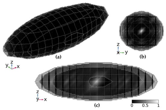 The mesh representation of the result in Figure 14a. (a–c) show the mesh representation of the structures corresponding to when Reynolds number is 0 from different perspectives.