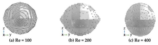 It is not difficult to see that there is a big difference in the structure of objective function and in three-dimensional problems. Compared with the body shapes in Figure 10, this group of structures seems to be covered with a thick shell in the middle of the spindle cylinder, which is particularly evident from the structure corresponding to Re = 1 in Figure 14b. We guess that the effect of convection term may widen the middle of the structure in this problem. In order to verify this idea and make the result more obvious, we purposely remove the Z-axis component of the convection term in and obtain the following results in Figure 16. It is obvious from Figure 16b,c that with Y-axis component of the convection term, the Y-direction of body is wider. Without Z-axis component of the convection term, there is no material growth in the central main part in the Z- direction. In addition, the convection effect enhances with the increase of the Reynolds number. Therefore, when the Reynolds number is less than 200, the shape changes little, while when it is greater than 300, the effect is obvious.