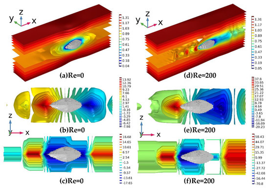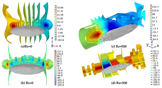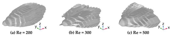 Regarding the change of pressure with the Reynolds number, it is more intuitive to observe from the pressure iso-surface of the 3D body shapes, in Figure 22. At the same time, it is observed that the pressure gradient on the 3D structural surface has the alternating change process of the positive gradient and negative gradient along the direction of fluid travel (X-direction). In addition, at each interval of the favorable or adverse pressure gradient, the pressure gradient decreases follow the direction of the outer normal of the wall. The largest and second largest positive pressure gradients occur in the flow field near the head and tail of the structure, while the maximum value section of the negative pressure gradient gradually moves from the tail cusp along the X-axis direction to the shoulder of the structure as the Reynolds number increases from 0 to 500.
