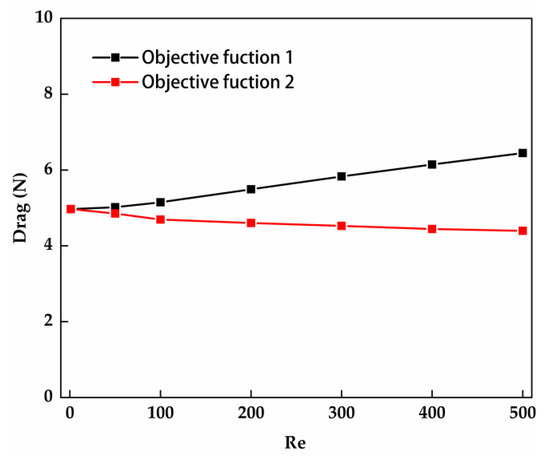 Next, we compare the change of drag value with Reynolds number between the two objective functions and . Since the results obtained from the two objective functions are using different area fractions, in order to compare at the same conditions and take into account the rapidity of calculation, we reduce the design domain and flow domain of the 3D model by 5 times; set the area fraction to 0.9; and obtain the change of the drag values with the Reynolds number corresponding to the two objective functions, as shown in the Figure 20.