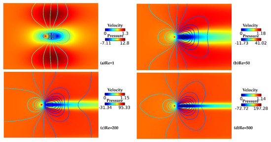 However, there are some differences of pressure field distribution between objective function 1 and 2. As shown in Figure 23, with the increase of the Reynolds number, the pressure position corresponding to the maximum negative value changes little; at the same time, the alternating frequency of positive and negative pressure gradient along the direction of fluid travel is not high.