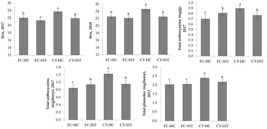 Variation in soluble solids (Brix) in 2017 and 2018; total anthocyanins expressed as mg/g and mg/berry in 2017 and total phenolics expressed as mg/berry in 2017 for the different combinations of treatments (FC-HC—full crop combined with high canopy; FC-SST—full crop combined with severe shoot trimming; CT-HC—cluster thinning combined with high canopy; CT-SST—cluster thinning combined with severe shoot trimming). Data were analyzed via one-way ANOVA in randomized blocks design. Different letters indicate significantly different means.